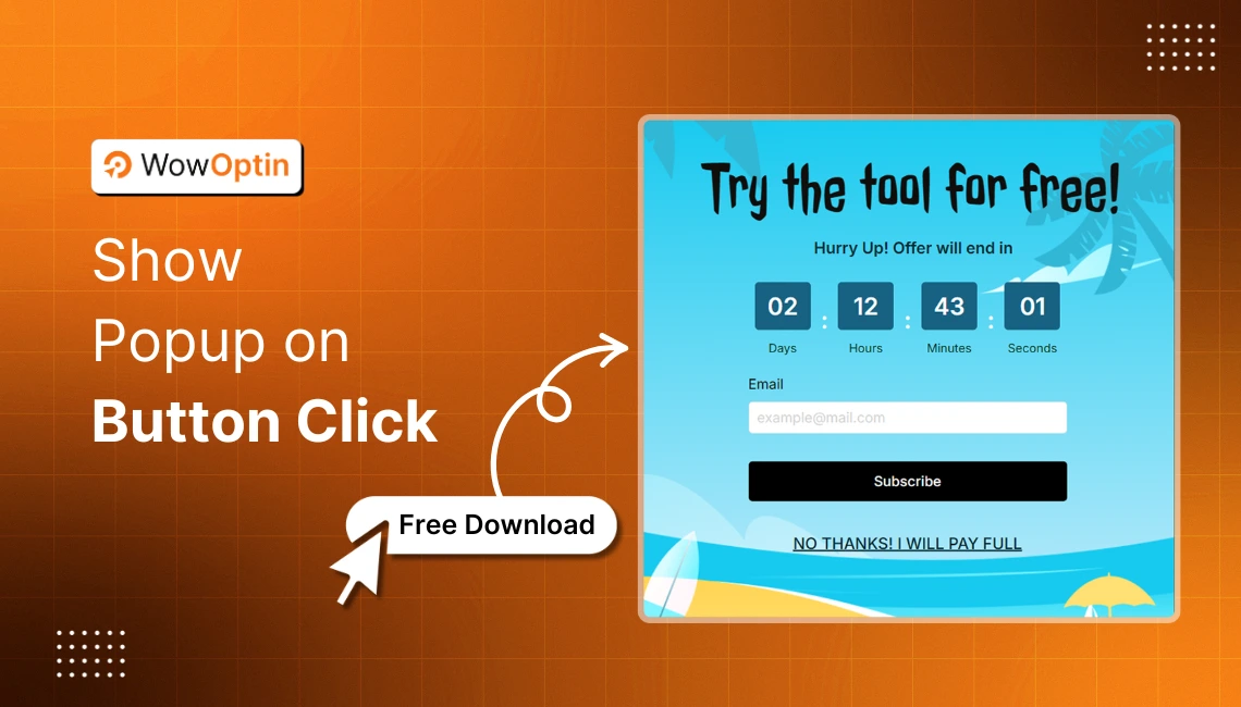 Yes, with WowOptin, you can easily create and display popups on button clicks without writing any code. WowOptin offers a no-code popup builder that lets you design and trigger popups using simple settings. Just create a popup, choose the “On Click” trigger, and link it to a button – and you are ready for success!